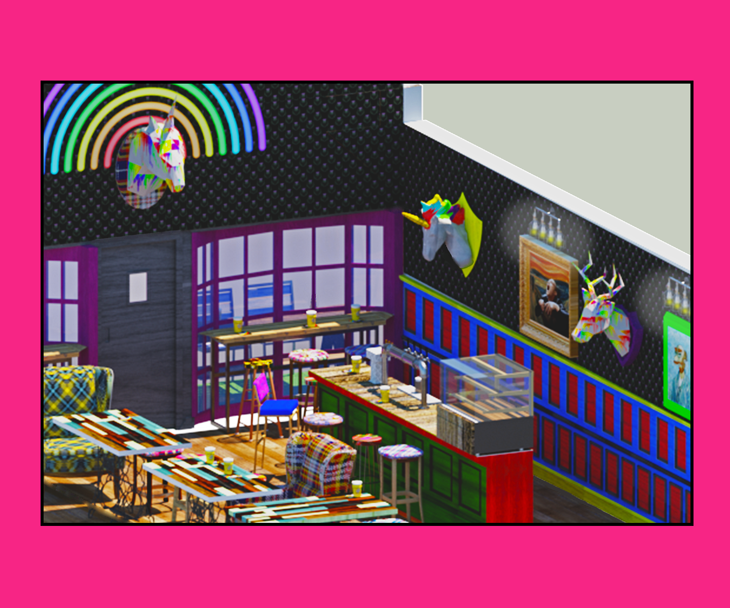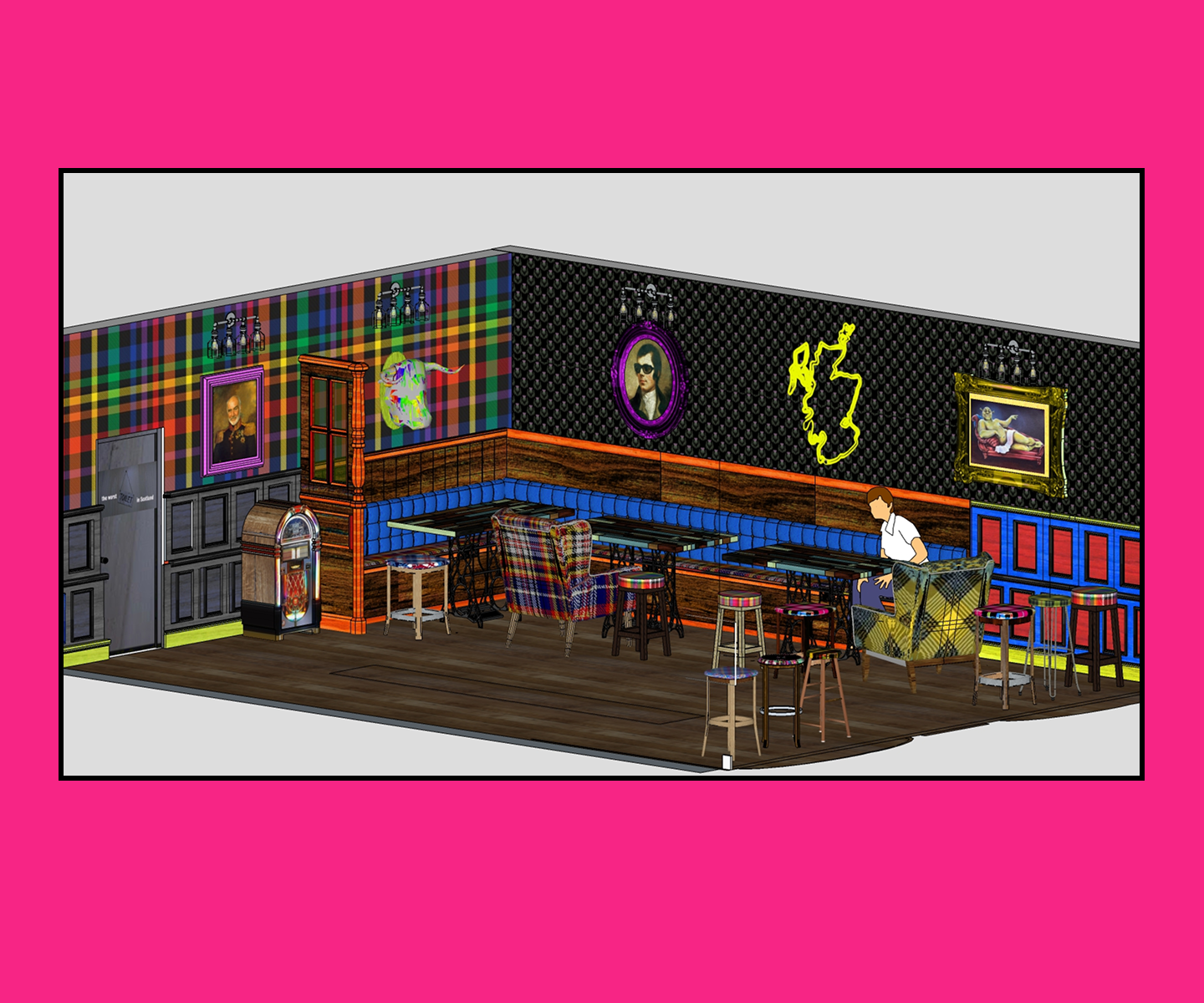 The Horny Horse is a bar concept design exploring an extremely kitsch, tongue-in-cheek approach to a Scottish-themed LGBTQI+ venue. The project reimagines the traditional Scottish bar through a bold, colourful and playful lens, updating familiar references into something more vibrant, inclusive and celebratory. The aim was to create a space that feels rooted in place while unapologetically fun and contemporary.